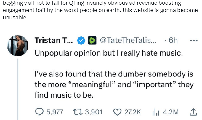 On X, the more engagement a tweet gets, the more visible it becomes on the platform. Ultimately, this is due to the algorithms used by X. Those who engage in engagement farming take advantage of algorithmic bias. According to the Harvard Business Review, algorithmic bias occurs when algorithms “make decisions that systemically disadvantage certain groups.” In the case of engagement farming, taking advantage of the algorithms looks like tweeting provocative images and misinformation, prompting controversy and encouraging overall response. While this is the most familiar type I am familiar with, there are many other ways to get engagement.